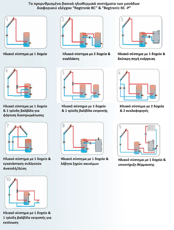 Δυνατότητα επιλογής μεταξύ 10 προρυθμισμένων βασικών ηλιοθερμικών συστημάτων
