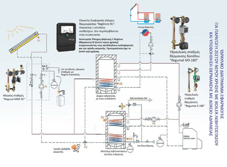 Υδραυλικό διάγραμμα εφαρμογής για παραγωγή ζεστού νερού χρήσης με boiler λεβητοστασίου και υποβοήθηση θερμανσης με δοχείο αδράνειας