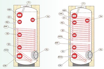 Acumuladores preparados por collegamento com colectores solares e/ou bomba de calor como segunda fonte energética. Porta serpentina com grande superfície e capacidade que pode satisfazer as necessidades da bomba de calor.